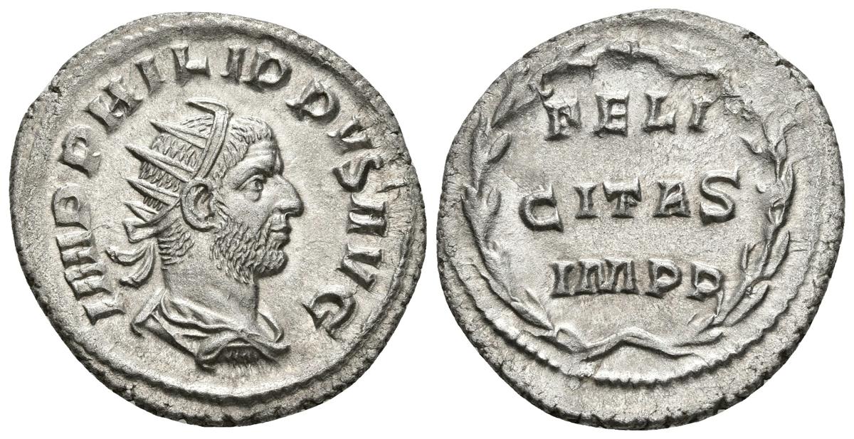 FILIPO I. Antoniniano. 247-249 d.C. Roma. A/ Busto radiado y drapeado con coraza a derecha. IMP PHILIPPVS AVG. R/ Corona y en el centro FELICITAS IMPP en tres líneas. RIC 60. Ar. 4,01g. EBC.