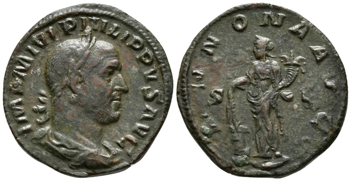 FILIPO I. Sestercio. 144-149 d.C. Roma. A/ Busto laureado y drapeado con coraza a derecha. IMP M IVL PHILIPPVS AVG. R/ Annona estante a izquierda portando cornucopia y espigas sobre modio. ANNONA AVGG/S-C. RIC 168. Ae. 16,77g. MBC+.