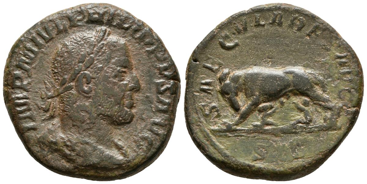FILIPO I. Sestercio. 249 d.C. Roma. A/ Busto laureado y drapeado con coraza a derecha. IMP M IVL PHILIPPVS AVG. R/ Loba a izquierda con la cabeza vuelta y amamantando a los gemelos, Rómulo y Remo. SAECVLARES AVGG, en exergo SC. RIC 159. Ae. 16,69g. MBC/MBC+.
