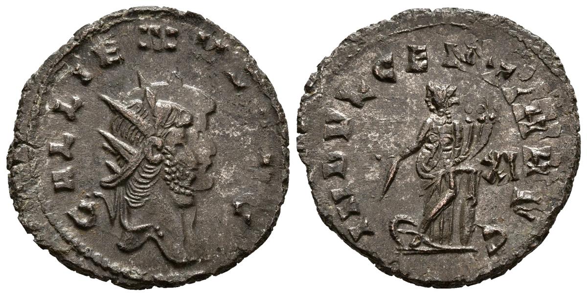 GALIENO. Antoniniano. 264-265. Roma. A/ Busto radiado a derecha. GALLIENVS AVG. R/ Indulgencia estante a izquierda portando cornucopia y vara, esta reposando sobre columna, en el campo XI. INDVLGENTIA AVG. RIC V 206var; RSC 331. Ae. 3,59g. Doble acuñación. EBC-.