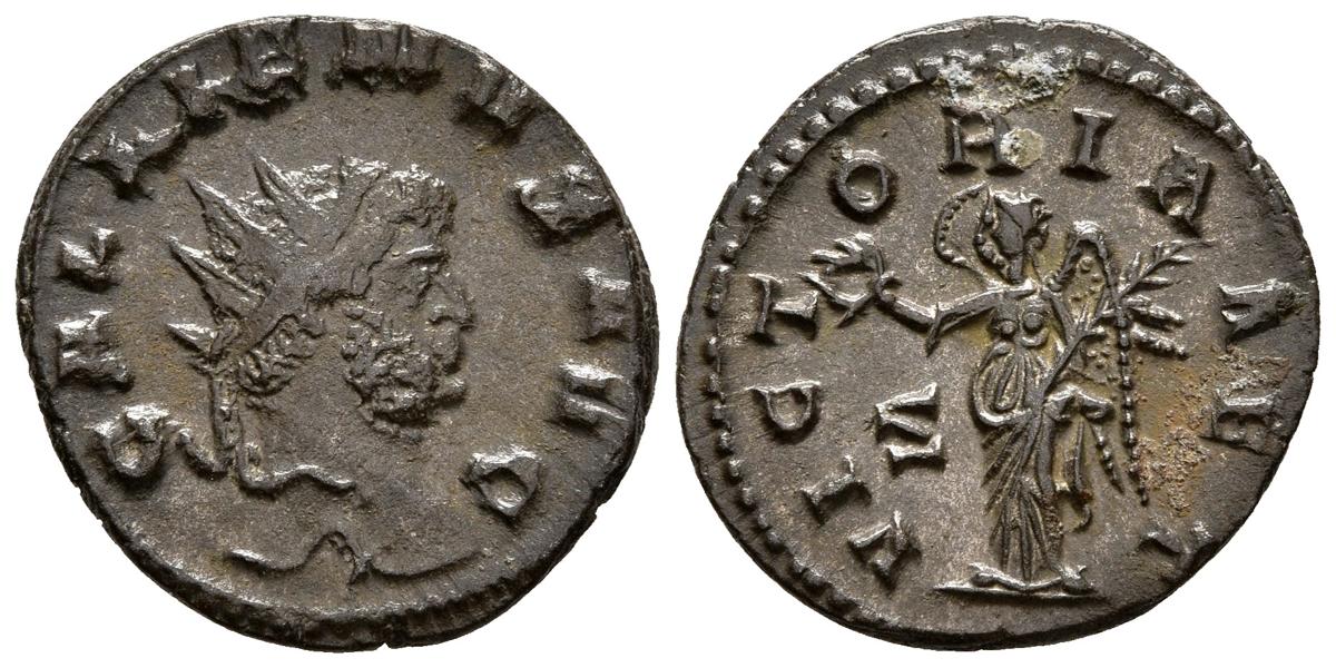 GALIENO. Antoniniano. 253-268 d.C. Roma. A/ Busto radiado a derecha. GALLIENVS AVG. R/ Victoria estante a izquierda portando corona de laurel y palma, en campo Z invertida. VICTORIA AET. RIC 297; Cohen 1072. Ae. 3,08g. MBC+/EBC.