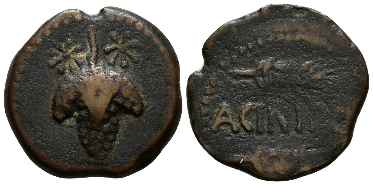 ACINIPO. As. 120-50 a.C. Ronda (Málaga). A/ Racimo de uvas, sobre este dos estrellas. R/ Dos espigas a derecha. ACINIPO. FAB-48. Ae. 7,39g. MBC+.