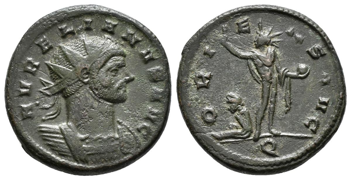 AURELIANO. Antoniniano. 270-175 d.C. Siscia. A/ Busto radiado y drapeado con coraza a derecha. AVRELIANVS AVG. R/ Sol estante a derecha con cabeza vuelta a izquierda alzando su mano y portando globo, a sus pies cautivo, en exergo Q. ORIENS AVG. RIC 250. Ae. 4,91g. MBC/MBC+.