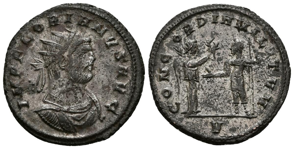 FLORIANO. Antoniniano. 276 d.C. Roma. A/ Busto radiado y drapeado con coraza a derecha. IMP C FLORIANVS AVG. R/ Victoria a izquierda sosteniendo palma y ofreciendo corona al emperador a derecha, este porta cetro y extiende su mano para recibir la corona. CONCORDIA MILITVM, en exergo V. RIC 116. Ve. 4,29g. Conserva el plateado original. MBC+.