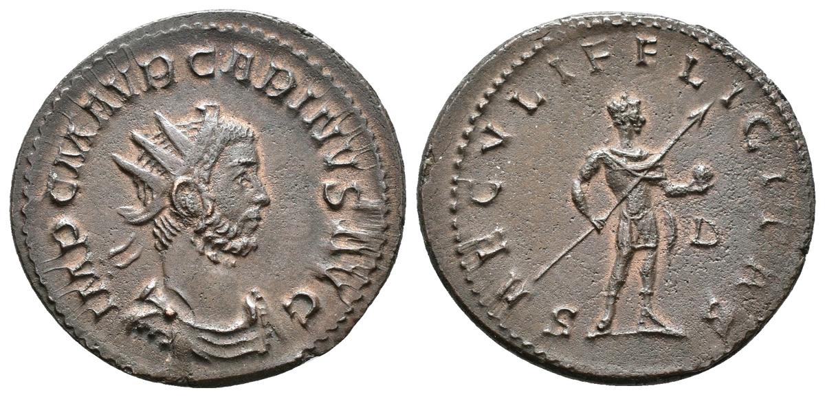 CARINO. Antoniniano. 283-285 d.C. Lugdunum. A/ Busto radiado y drapeado con coraza a derecha. IMP C M AVR CARINVS AVG. R/ Carino con atuendo militar estante a derecha, portando lanza y globo, en el campo derecho D. SAECVLI FELICITAS. RIC 214. Ae. 3,32g. Buen ejemplar. EBC-.