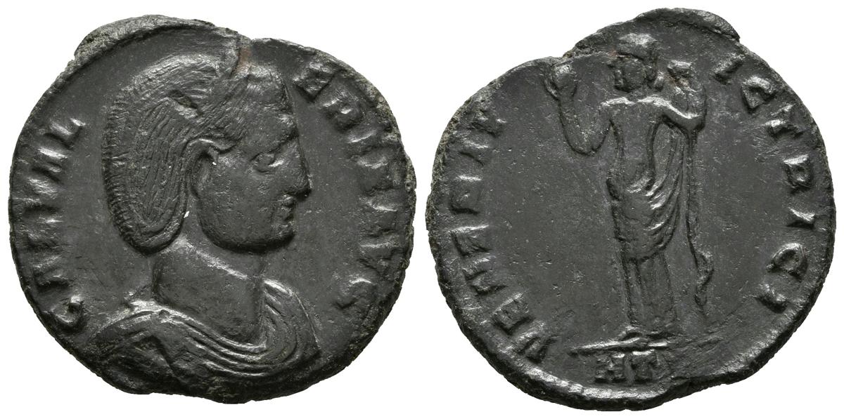 GALERIA VALERIA. Follis. 309-310 d.C. Heraclea. A/ Busto con diadema y drapeado a derecha. GAL VALERIA AVG. R/ Venus estante a izquierda con manzana y sosteniendo su vestido. VENERI VICTRICI, en exergo HTB. RIC 43. Ae. 6,02g. MBC.