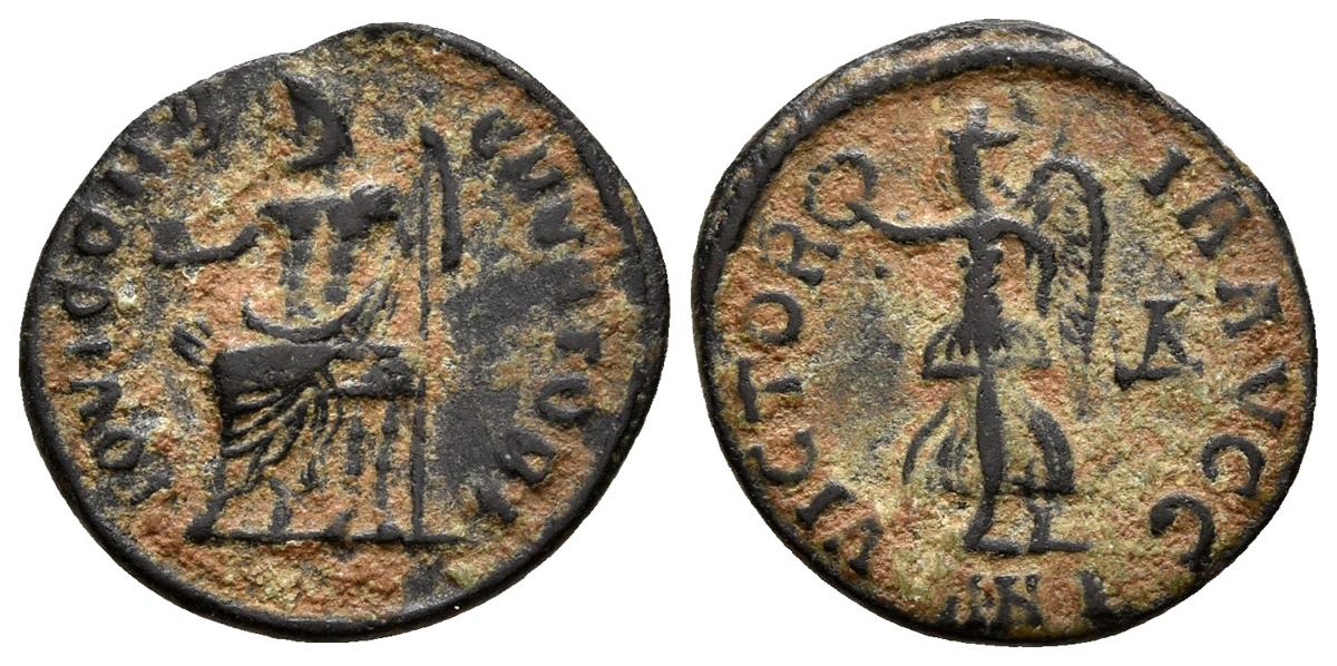 TIEMPOS DE MAXIMINO II. Follis. 310-313 d.C. Antioquia. A/ Júpiter sedente en trono a izquierda portando cetro y globo IOVI CONSERVATORI. R/ Victoria avanzando a izquierda sosteniendo corona y palma. VICTORIA AVGG, en exergo ANT. Van Heesch, Last 2; McAlee 171h. Ae. 1,45g. MBC+.