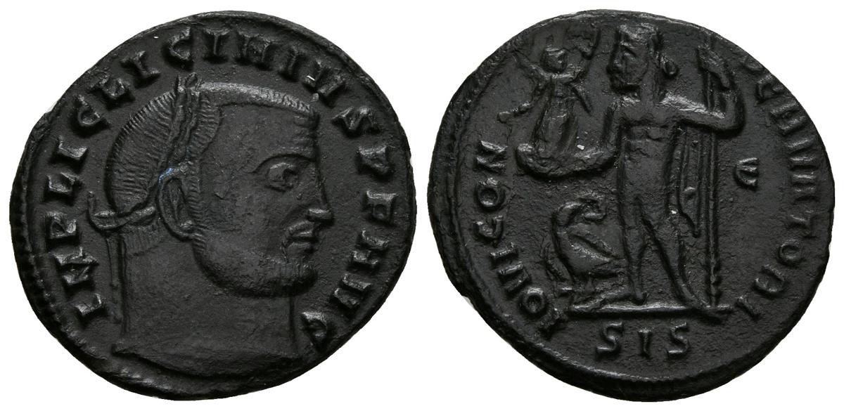 LICINIO I. Follis. 313-315 d.C. Siscia. A/ Busto laureado a derecha. IMP LICINIVS P F AVG. R/ Júpiter a izquierda sosteniendo victoria sobre globo y cetro, a sus pies águila con corona en el pico. IOVI CONSERVATORI, en exergo SIS. RIC 8; Spink 15211. Ae. 3,06g. MBC+.