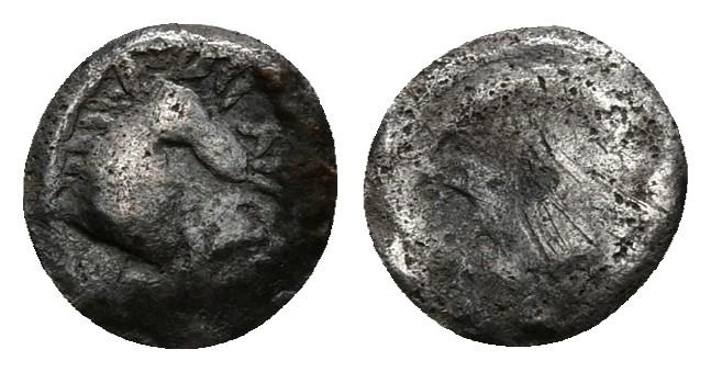 ARSE-SAGUNTO. Hemióbolo. Sagunto (Valencia). 300-200 a.C. A/ Cabeza de caballo a derecha. Delante leyenda "ETEBANAR" R/ Cabeza femenina galeada a derecha. Vill-1938; FAB-2042. Ar. 0,19g. BC-/MBC-. Escasa.