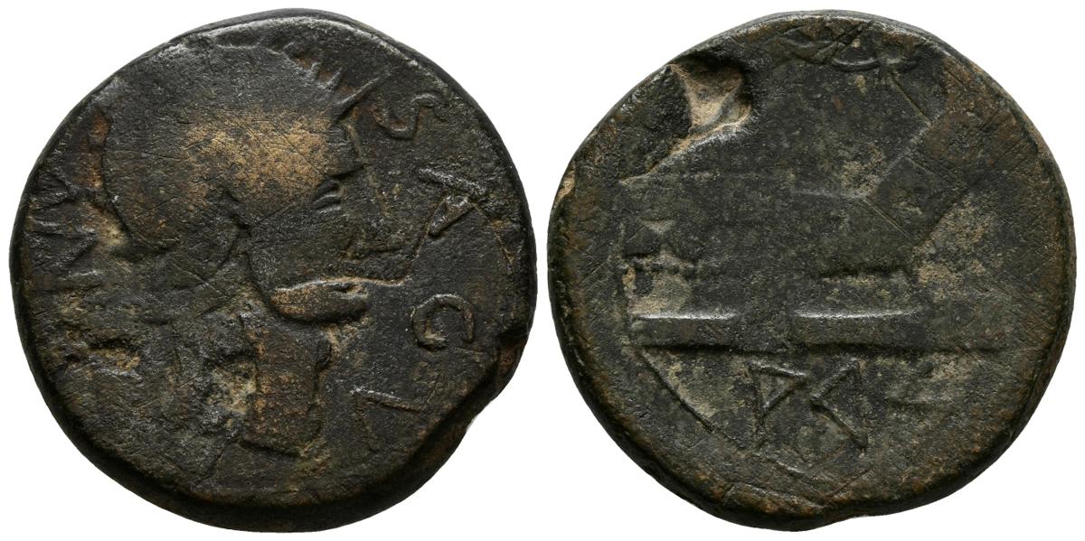 ARSE-SAGUNTO. As. 50-20 a.C. Sagunto (Valencia). A/ Cabeza galeada a derecha, alrededor SAGVNT-INV. R/ Proa de nave a derecha coronada por una victoria volando encima, delante caduceo, debajo leyenda ibérica ARSE. FAB-2083. Ae. 17,89g. MBC-/BC+.