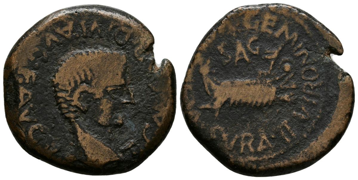 ARSE-SAGUNTO. Semis. Epoca de Tiberio. 14-37 a.C. Sagunto (Valencia). A/ Cabeza de Tiberio laureado a derecha. TI CAESAR DIVI AVG F AVGV. R/ Galera a derecha encima SAG, leyenda L SEMP GEMINO L VALER SVRA II VIR. FAB-2091. Ae. 10,69g. BC+. Escasa.