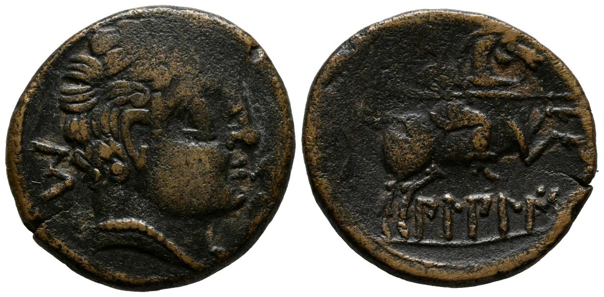 BILBILIS. As. 120-30 a.C. Calatayud (Zaragoza). A/ Cabeza masculina a derecha, delante delfines, detrás letra ibérica S. R/ Jinete con lanza a derecha y abajo leyenda ibérica BiLBiLIS. FAB-254. Ae. 11,25g. Vano. MBC+.