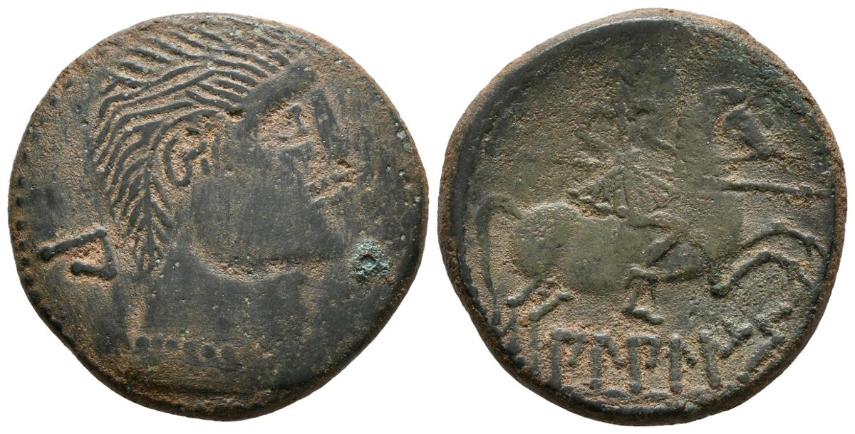 BILBILIS. As. 120-30 a.C. Calatayud (Zaragoza). A/ Cabeza masculina a derecha, delante delfín, detrás letra ibérica Bi. R/ Jinete con lanza a derecha, debajo BiLBiLIS. FAB-258. Ae. 11,58g. MBC+.