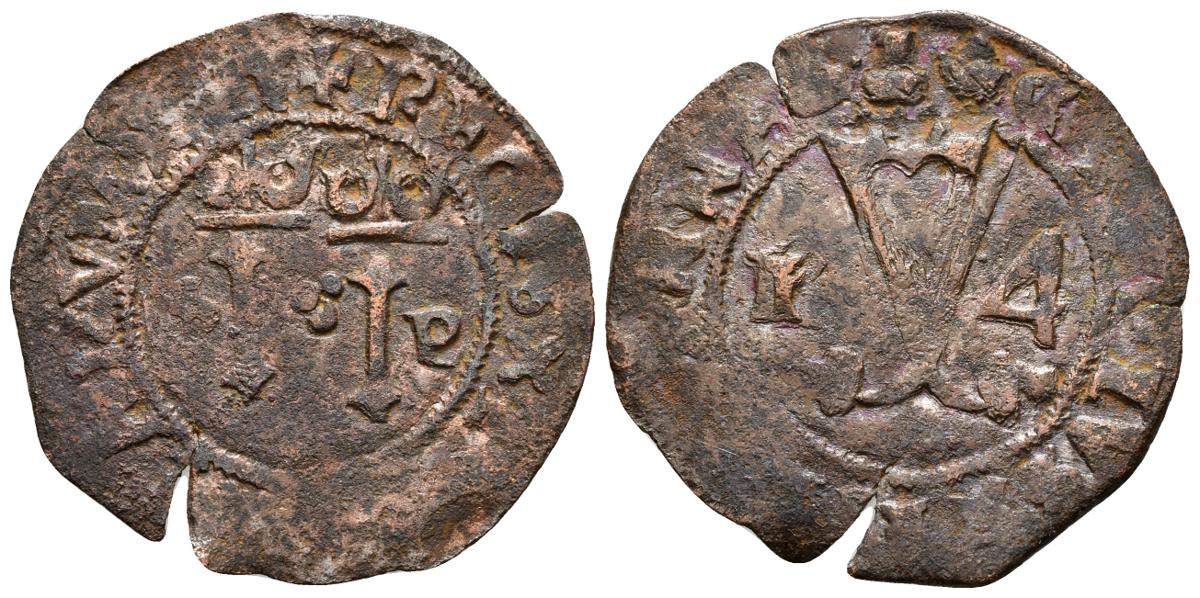 JUANA Y CARLOS. 4 Maravedís. (1504-1555). Santo Domingo. A/ F-4. R/ S-P. Cal-211. Ae. 2,99g. MBC-.