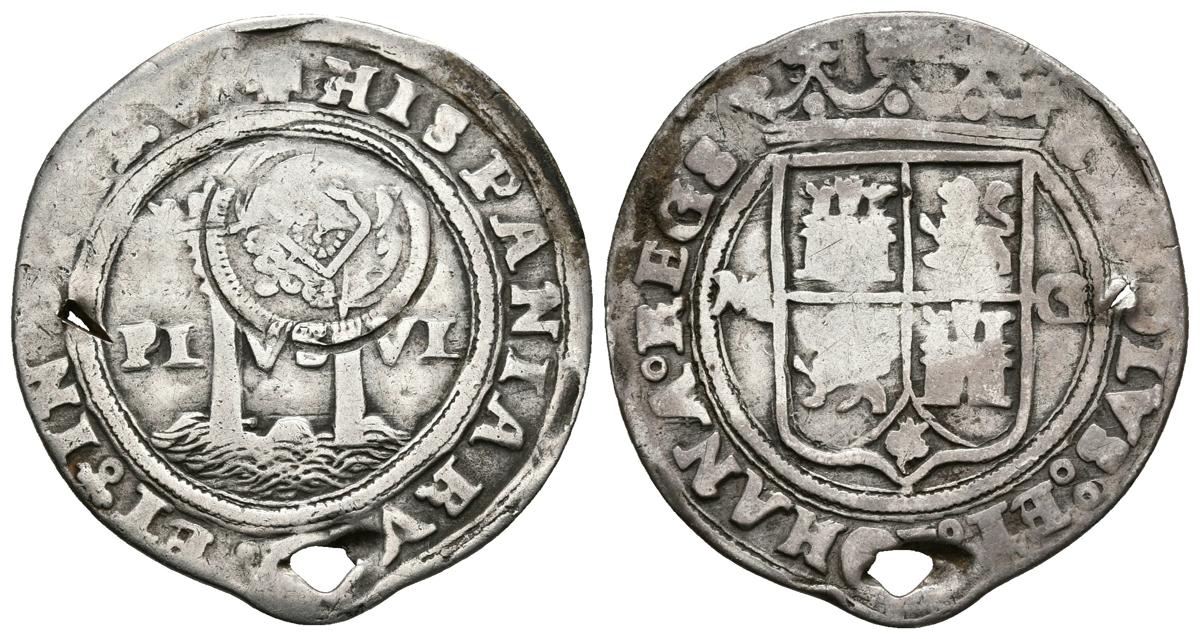 JUANA Y CARLOS. 1 Real. S/D. México M-G. Resello de El Salvador (De Mey 1097). Cal-140. Ar. 3,00g. Perforación. MBC-.