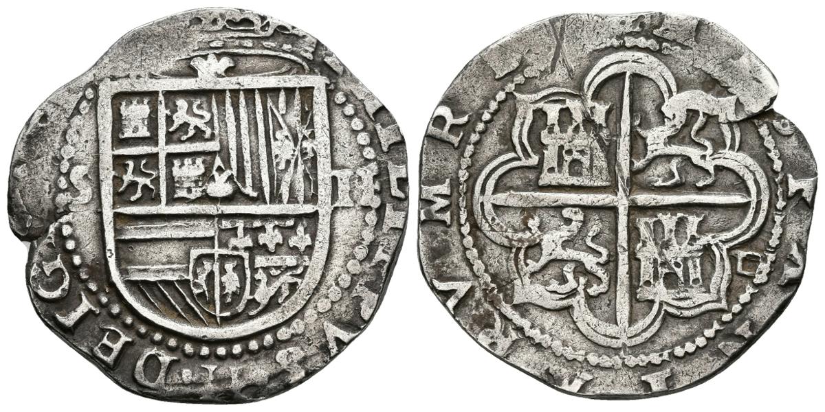 FELIPE II. 2 Reales. S/D. Sevilla. Ensayador en 4º cuartel. Cal-535. Ar. 6,78g. MBC+.