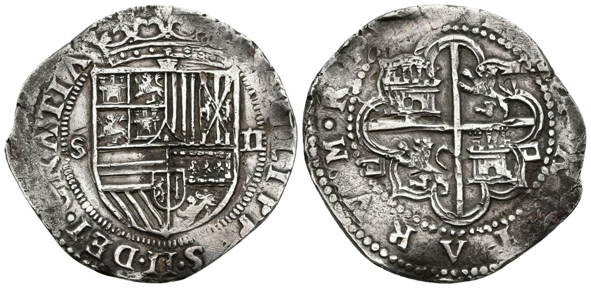 FELIPE II. 2 Reales. S/D. Sevilla. Ensayador en 3º y 4º cuartel. Cal-536. Ar. 6,70g. MBC+. Escasa.