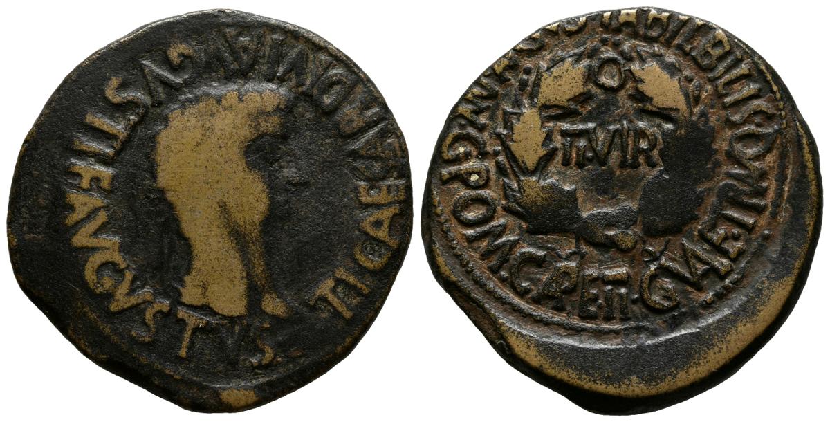 BILBILIS. As. Epoca de Tiberio. 14-36 d.C. Calatayud (Zaragoza). A/ Cabeza laureada de Tiberio a derecha. TI. CAESAR DIVI, AVGVSTI. F. AVGVSTVS. R/ Laurea con II VIR en el centro y alrededor NUM. AVGVSTA BILBILIS G. POM. CAPELI. G. VALE. TRANQ. FAB-283. Ae. 10,82g. BC+/MBC.