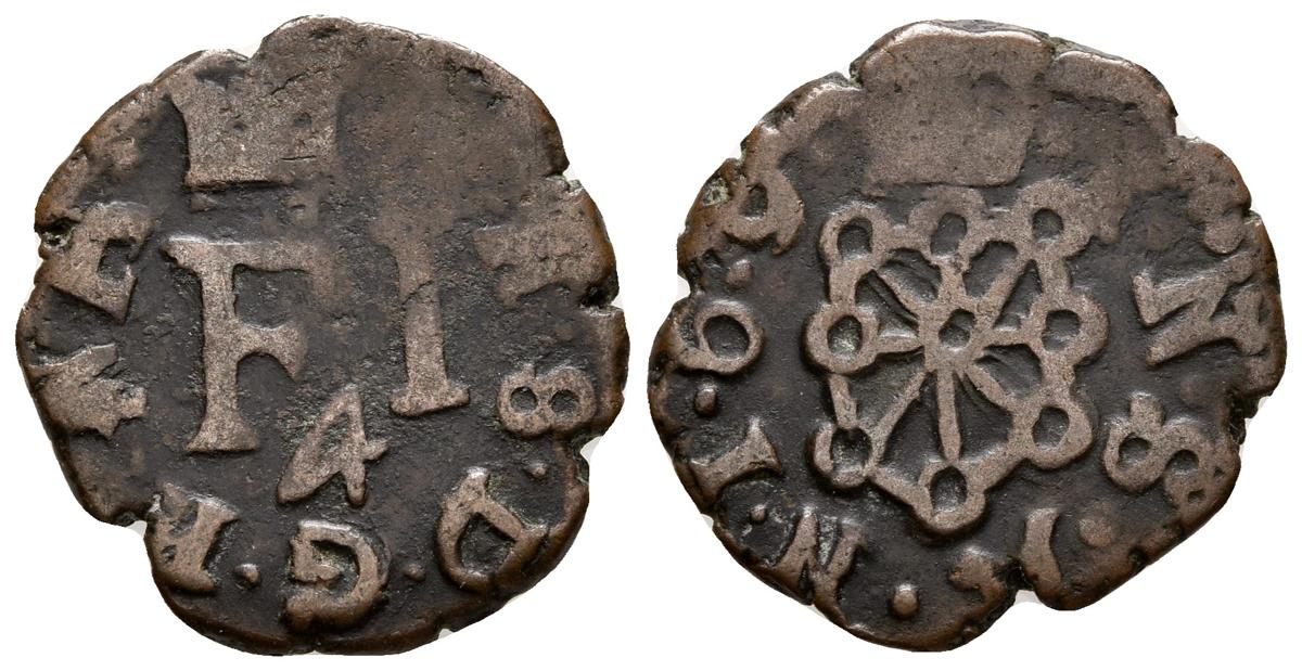 FELIPE III. 4 Cornados. 1·6·9. Pamplona. Cal-719var; R.Ros 4.4.14. Ae. 3,49g. MBC-.