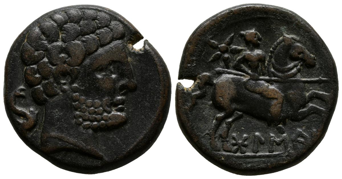 BOLSCAN. As. 180-20 a.C. Huesca. A/ Cabeza barbada a derecha, detrás delfín. R/ Jinete con lanza a derecha, encima estrella. FAB-1918. Ae. 9,72g. MBC+.