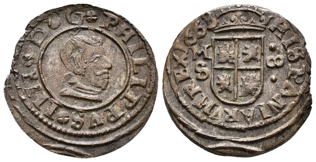 FELIPE IV. 8 Maravedís. 1663. Madrid S. El 8 del valor horizontal y tres puntos sobre el busto. Cal-1426; J.S. M-431. Ae. 2,18g. MBC+. Rara.