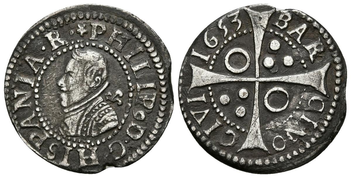FELIPE IV. 1 Croat. 1653. Barcelona. Cal-982. Ar. 2,96g. Pátina. MBC+. Escasa.