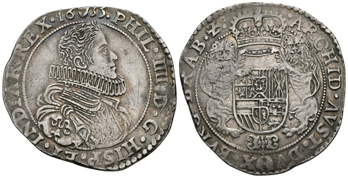 FELIPE IV. 1/2 Ducatón. 1635. Amberes. G.H. 328-1a; Delm. 279; W. 1005. Ar. 16,34g. Bella pátina. EBC-. Rara así.