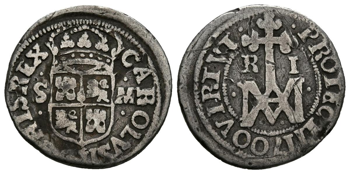 CARLOS II. 1 Real. 1700. Sevilla M. Tipo "María". Ceca y ensayador acotado por puntos. Cal-760. Ar. 2,57g. Limadura en el canto. MBC. Muy rara. Ex. Colección Lepanto 1999.