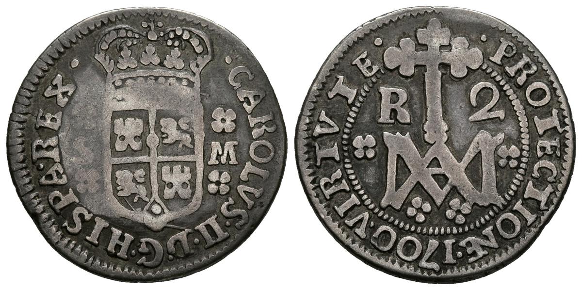 CARLOS II. 2 Reales. 1700. Sevilla M. Tipo "María". Gráfila interior en reverso pero con anagrama entre flores como el tipo sin gráfila. Cal-654. Ar. 4,48g. MBC. Muy rara. Ex. Colección Lepanto 1999.