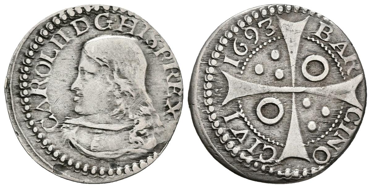 CARLOS II. 1 Croat. 1693. Barcelona. Sin punto entre D y G. CAL-669; Cru.C.G. 4906. Ar. 2,73g. MBC-.