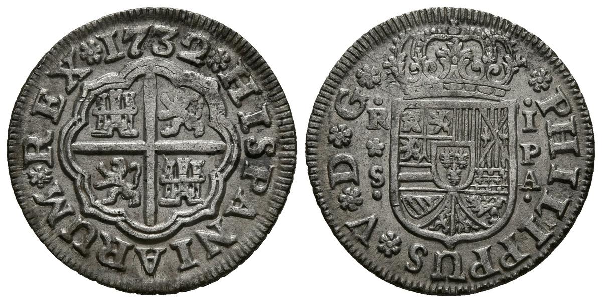 FELIPE V. 1 Real. 1732. Sevilla PA. Cal-1719. Ar. 2,88g. Marquitas en anverso. MBC+. Ex. Aureo 1-07-1999. Nº 330.