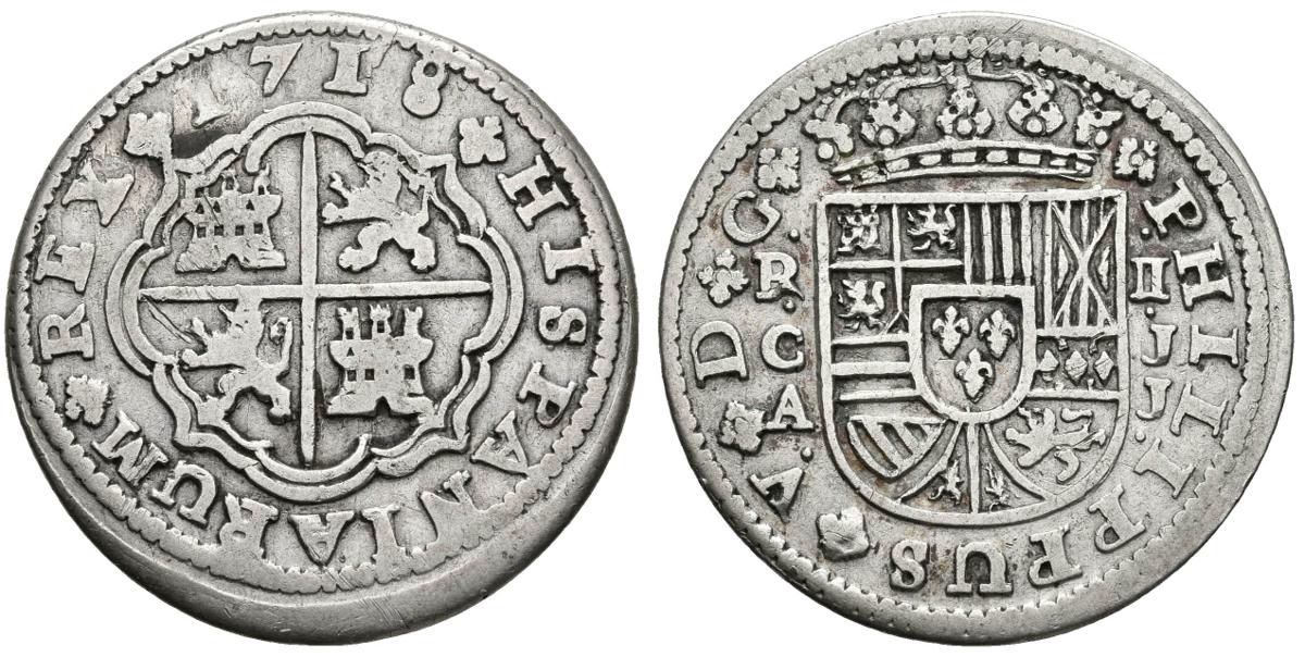 FELIPE V. 2 Reales. 1718. Cuenca JJ. Cal-1161. Ar. 4,79g. MBC-.