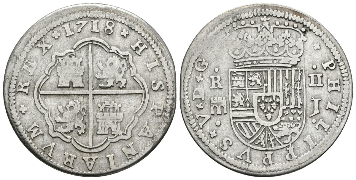 FELIPE V. 2 Reales. 1718. Segovia J. Acueducto de dos arcos. Cal-1388. Ar. 4,66g. MBC-.