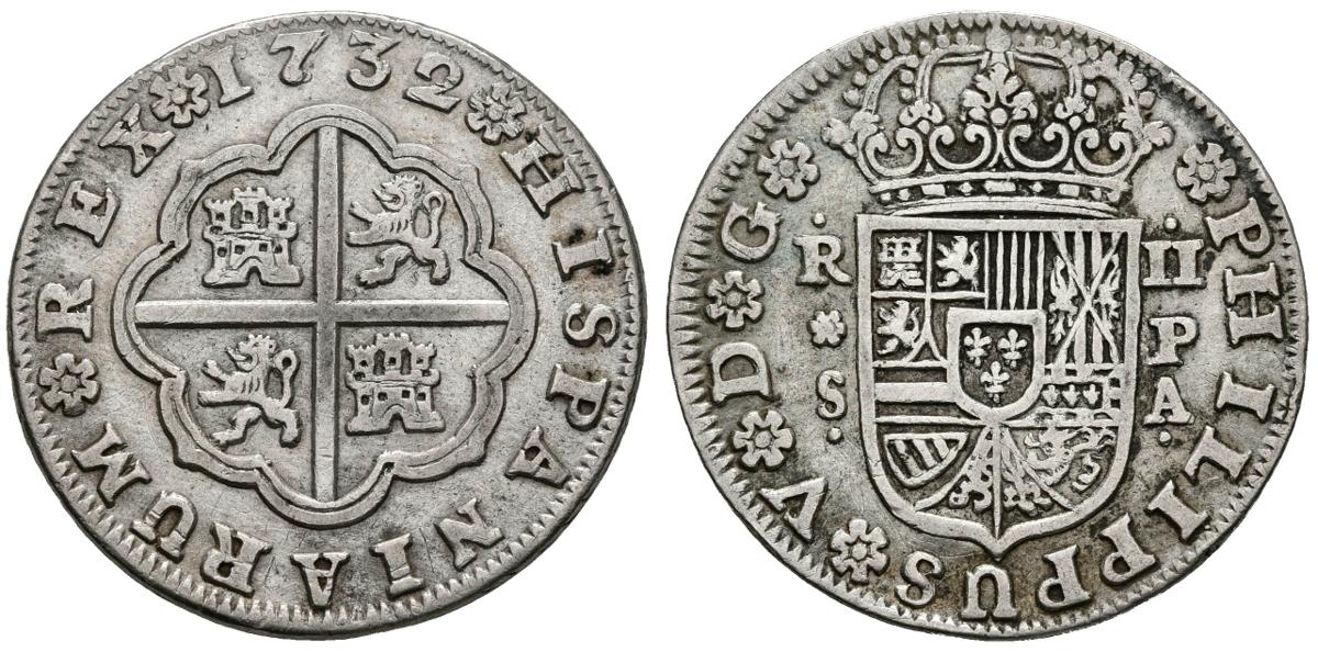 FELIPE V. 2 Reales. 1732. Sevilla PA. Cal-1432. Ar. 5,57g. MBC.