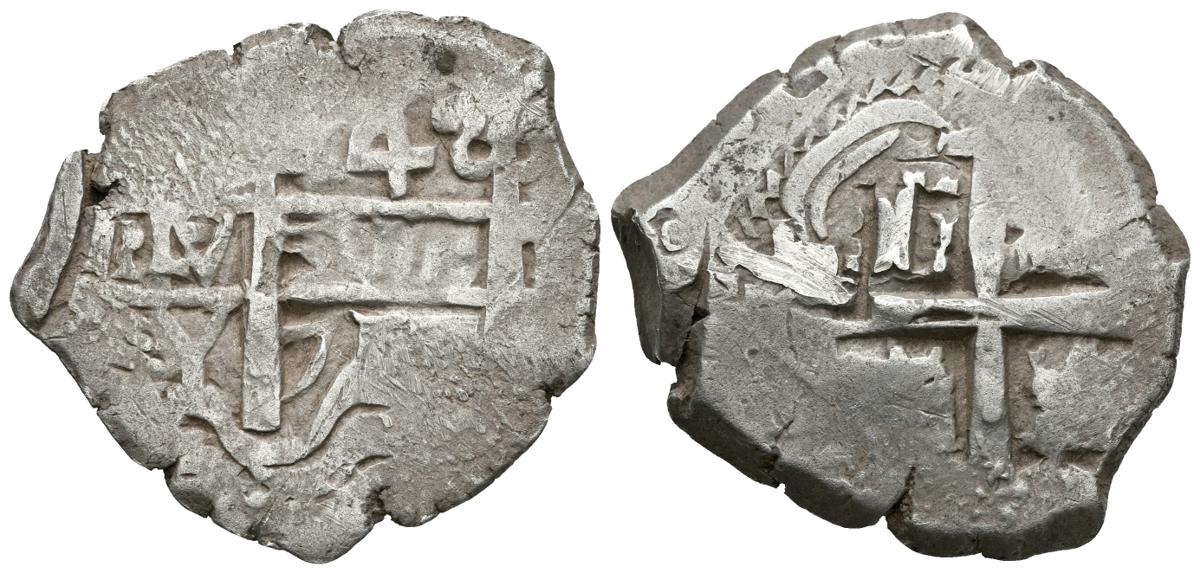 FELIPE V. 4 Reales. 171(7?) Potosí Y. Cal-1098. Ar. 13,22g. Golpe en anverso. MBC-. Escasa.