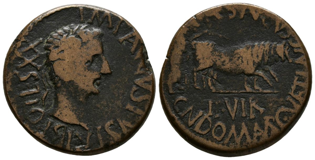 CAESARAUGUSTA. As. 120-30 a.C. Zaragoza. A/ Cabeza de Augusto laureada a derecha. IMP AVGVSTVS TRIB POTES XX. R/ Yunta a derecha, debajo II VIR y alrededor CAES AVGVS CN COM AMP C VET LANC. FAB-327. Ae. 9,78g. BC+/MBC-.