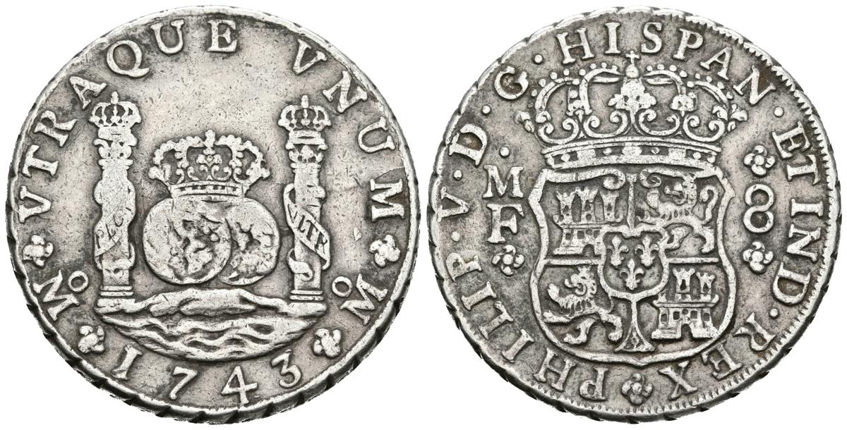 FELIPE V. 8 Reales. 1743. México MF. Columnario. Cal-794. Ar. 26,87g. MBC-/MBC. Escasa.