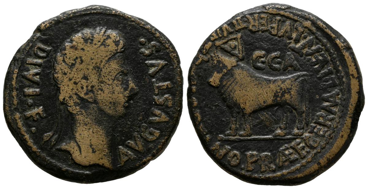 CAESARAUGUSTA. As. Epoca de Octavio. 27 a.C-14 d.C. Zaragoza. A/ Cabeza laureada de Octavio a derecha. AVGVSTVS DIVI F. R/ Toro mitrado a izquierda, encima CCA, alrededor (TIB CLOD FL)AVO PRAEF GERMAN L IVENT LVPER II VIR. FAB-328. Ae. 14,99g. MBC-.