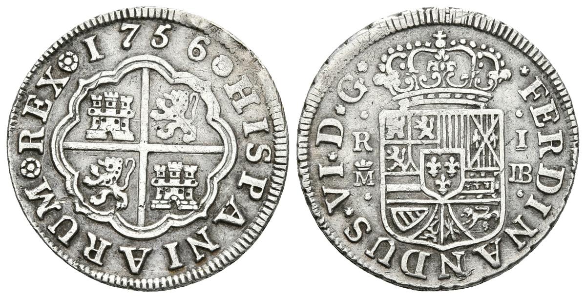 FERNANDO VI. 1 Real. 1756. Madrid JB. Línea debajo del valor. Cal-568. Ar. 2,91g. MBC+.