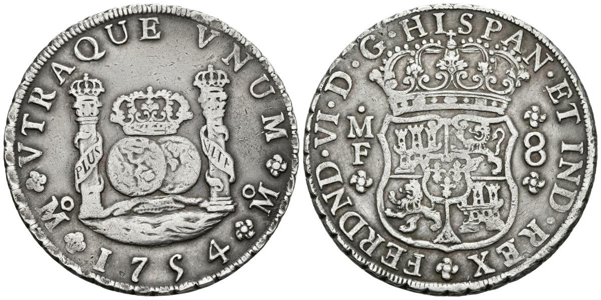 FERNANDO VI. 8 Reales. 1754. Méjico MF. Dos coronas reales. Columnario. Cal-333. Ar. 27,09g. MBC+. Escasa.