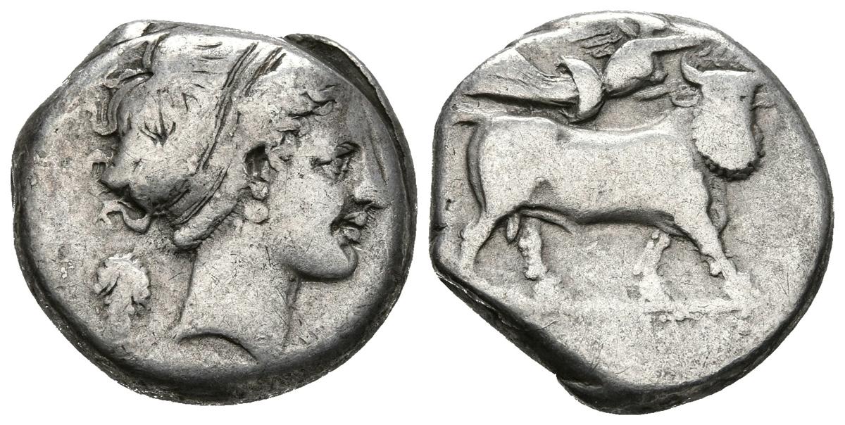 CAMPANIA. Neapolis. Didracma. 300-275 a.C. A/ Cabeza de Ninfa a derecha. R/ Toro con cabeza de hombre caminando a derecha, Nike sobre él coronándolo. HN Italy 579. Ar. 7,24g. MBC-.