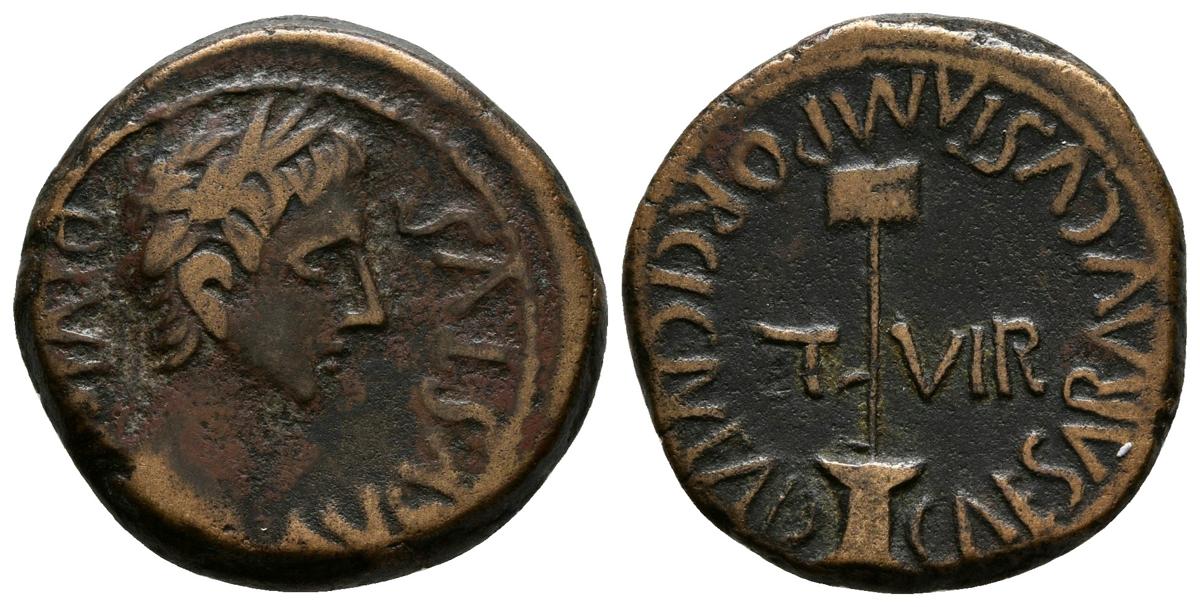 CAESARAUGUSTA. Semis. Epoca de Augusto. 27 a.C.-14 d.C. Zaragoza. A/ Cabeza laureada de Augusto a derecha. AVGVSTVS.DIVI.F. R/ Vexilo entre II.VIR, CAESARAVGVSTA.M.PORCI.CN.FAD. FAB-334. Ae. 6,30g. MBC/MBC+.