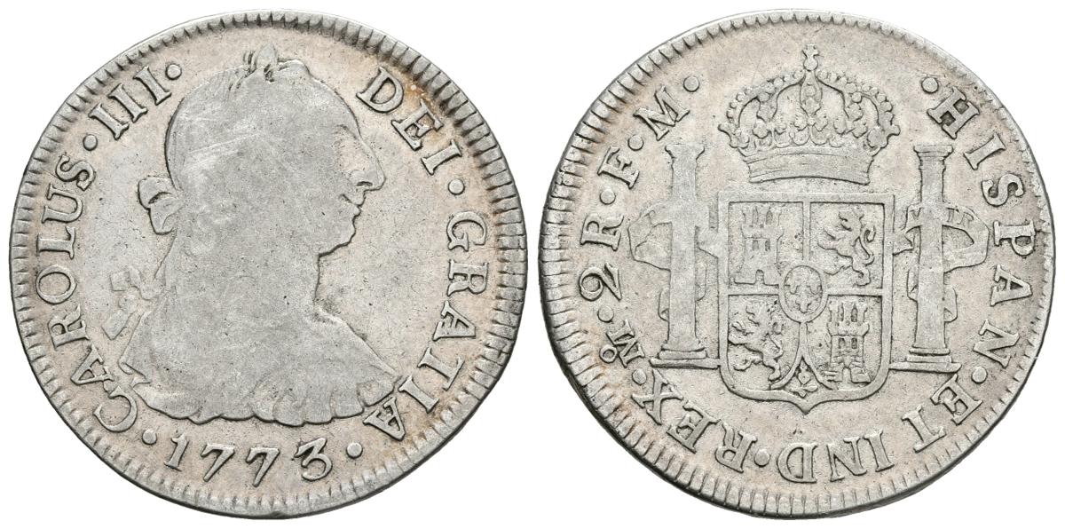 CARLOS III. 2 Reales. 1773. México FM. Cal-1340. Ar. 6,46g. BC+.