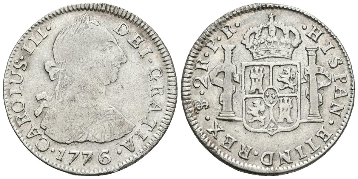 CARLOS III. 2 Reales. 1776. Potosí PR. Cal-1387. Ar. 6,70g. BC+/MBC-. Escasa.