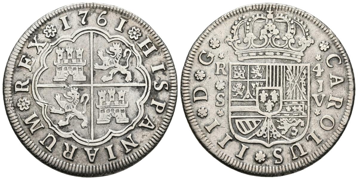 CARLOS III. 4 Reales. 1761. Sevilla JV. Cal-1218. Ar. 12,92g. MBC. Escasa. Ex. Aureo 27-04-2000 Nº3565.