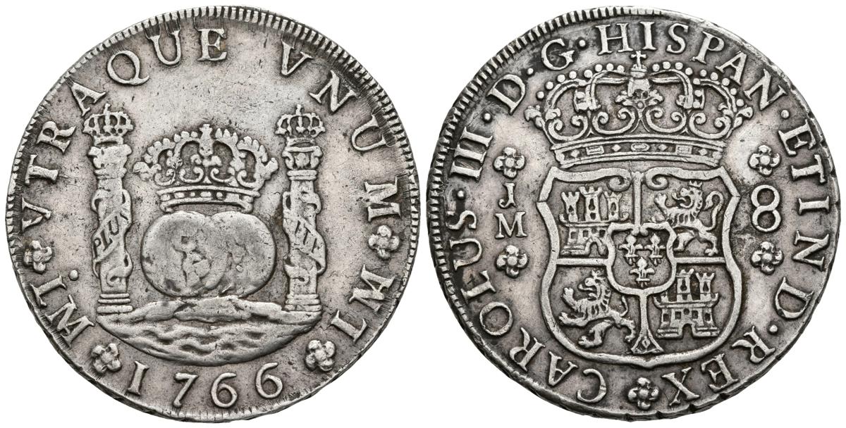 CARLOS III. 8 Reales. 1766. Lima JM. Columnario. Punto sobre la primera LMA. Cal-842. Ar. 27,03g. MBC+.