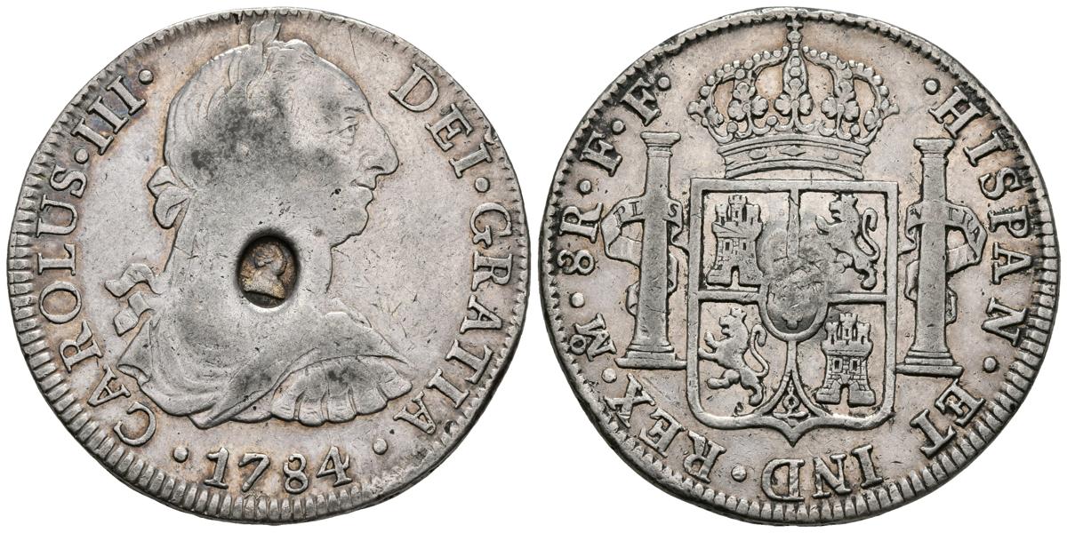 CARLOS III. 8 Reales. 1784. México FF. Resello ovalado con el busto de George III realizado por el banco de Inglaterra para circular como 1 Dóllar en 1804 (De Mey-659). Cal-936. Ar. 26,68g. MBC/MBC+. Rara.