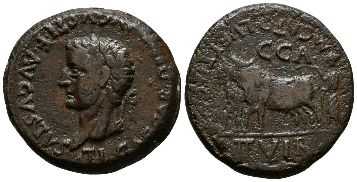 CAESARAUGUSTA. As. Epoca de Tiberio. 14-36 a.C. Zaragoza. A/ Cabeza laureada de Tiberio a derecha. TI CAESAR DIVI AVG F AVGVTVS. R/ Yunta a izquierda encima CCA, alrededor M CATO L VETTIACVS II VIR. FAB-361. Ae. 14,50g. MBC+/MBC-.
