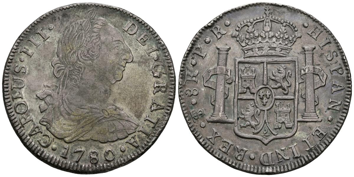 CARLOS III. 8 Reales. 1780. Potosí PR. Acuñada sobre otra moneda de 8 Reales. Cal-982. Ar. 27,11g. Preciosa pátina. EBC.