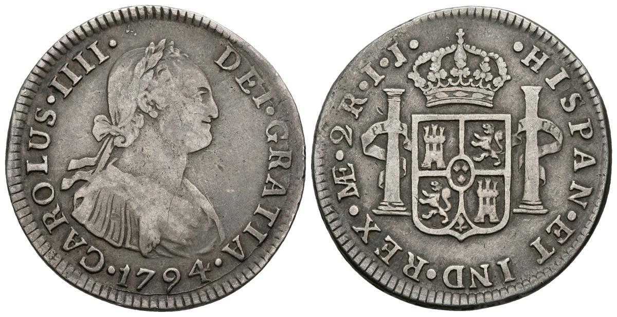 CARLOS IV. 2 Reales. 1794. Lima IJ. Cal-941. Ar. 6,63g. Pátina. MBC-/MBC.
